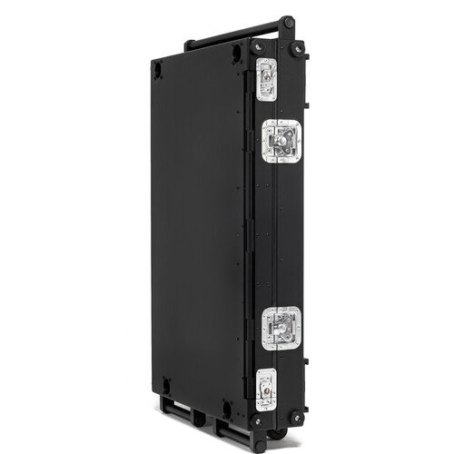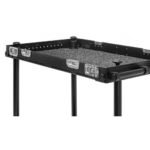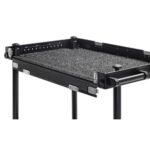 The adicam Standard+ Film Cart can support up to 440 lb of equipment. The top shelf features two accessory mounting plates with 1/4″-20 and 3/8″-16 threaded mounting holes. Releasing locks on the top shelf allows the edge to fold down for working with a laptop or keyboard. The 9″ pneumatic wheels and riser tubes fit into the bottom shelf, and the top shelf flips over and then locks using the silver latches. Integrated wheels help you roll the “folded” cart for transport when not in use.