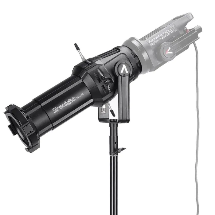 Offering a high degree of control, this Aputure Spotlight Mount Set is a versatile light modifier with an included 26° lens for producing a dramatic yet clean beam of light. Featuring a Bowens mount, this modifier can be easily attached to a variety of lights, including the Light Storm LC 120d II, 120D, and 300D, and its integrated yoke has a dual junior/baby mount for attaching to anything from a C-stand to a lighting grid. The Spotlight’s design incorporates a dual drop-in slot, which can accept the included B-size gobo holder, included gel holder, or an optional adjustable iris for further control over the shape and size of the light beam. Like a conventional ellipsoidal light, too, the lens can be easily swapped in order to achieve a different beam angle. The Spotlight Mount has a durable aluminum alloy housing and this kit is delivered in a hard travel case to protect the housing, lens, and accessories during transport.
