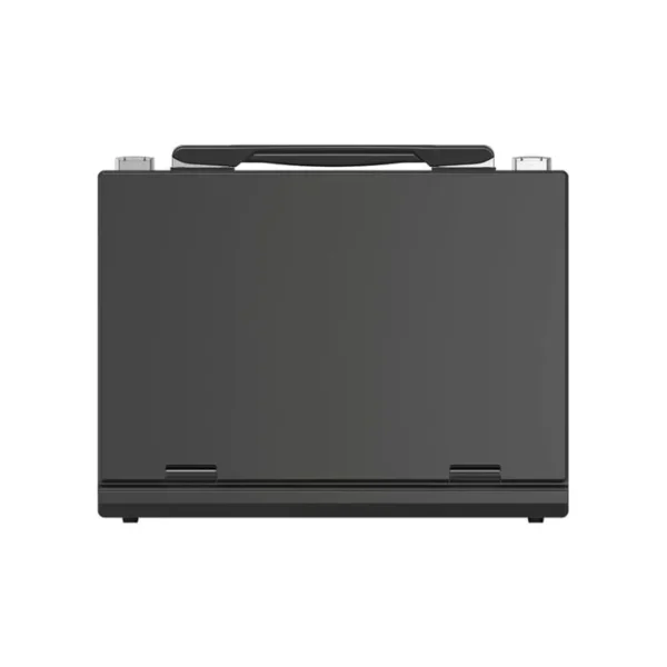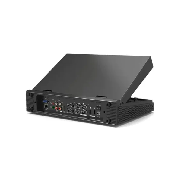 In an all-in-one portable design, the switcher is housed in a robust metal case and has a 13.3″ Full HD IPS display and familiar switching controls, including a T-bar. The display allows for multiview monitoring of six sources along with PVW and PGM with an audio meter. A clock and a menu list are also displayed in the bottom right corner.