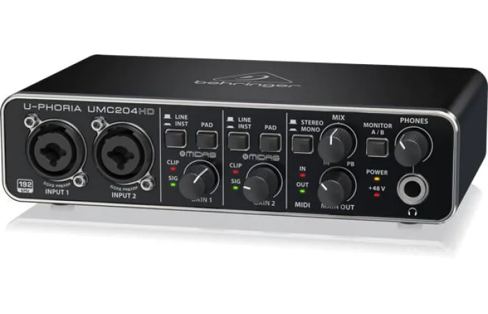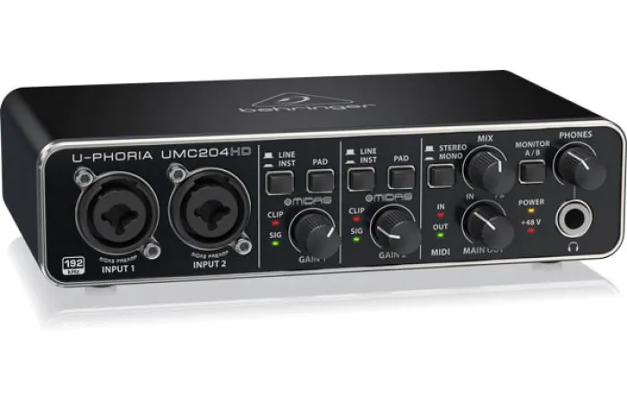 The U-PHORIA UMC204HD is a powerful 2 input, 4 output USB recording interface featuring genuine MIDAS-designed mic preamps with exceptional 24-Bit/192 kHz high-resolution converters, designed to help your recordings and mixes sound their absolute best.