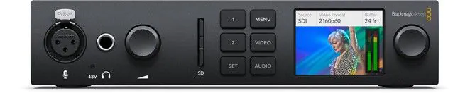 A built-in LCD screen enables you to monitor your signal, and an SD card reader provides instant access to your SD media. The compact UltraStudio 4K Mini’s Thunderbolt 3 interface offers lightning-fast connections and will trickle-charge a connected computer. Audio features include 16-channel SDI and 8-channel HDMI embedded input and output, a 3-pin XLR audio input, and a headphone output.