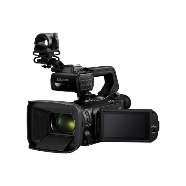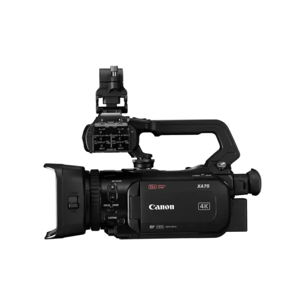 The Canon XA75 Professional UHD 4K Camcorder is a compact, lightweight camera featuring UHD 4K capture, a 1″ CMOS sensor, two XLR audio inputs, and one each mini-HDMI and BNC 3G-SDI output, which fits right into the ENG category for documentary or journalism-style productions. Updated from its XA55 predecessor, this model features a larger 3.5mm LCD capacitive touchscreen display, a higher resolution tiltable 0.36″ OLED EVF, OSD metadata recording, and fast USB Type-C video-only output with UVC support for livestreaming to a computer.