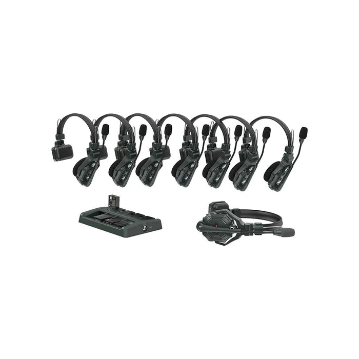 The Hollyland Solidcom C1-8S is a full-duplex wireless DECT intercom system engineered to provide clear audio and all-day wearing comfort in a true-wireless design with no bodypack or hub required. This configuration includes 8 single-sided headsets, 1 master and 7 remote units, along with rechargeable batteries, a charger, and accessories. The system uses DECT 6.0 encryption and dual antenna technology to ensure secure and reliable transmission at a range of up to 1000’—making it well suited for a variety of applications including film production, concerts, and public events.