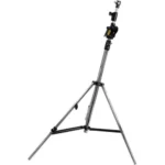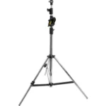 Extend the second riser of this 13′ Manfrotto Combi-Boom Stand to its maximum, press a lever, and you have a stand with a two section boom arm. When used as a boom stand, this steel-based stand with 2 aluminum risers has a maximum load capacity of 11 lb – strong enough for a small light fixture with a small softbox or umbrella.