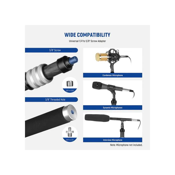 With the included screw adapters, you can accommodate virtually any microphone, from condensers to dynamics and shotgun mics.