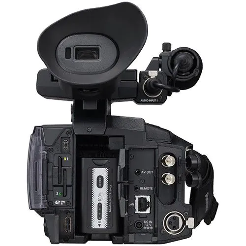 Integrated into the camera is a 20x optical zoom lens with 32x intelligent zoom. The lens features 5-axis image stabilization and three discrete lens control rings, one each for focus, iris, and zoom. The camera features an OLED EVF and a 3.2″ LCD touchscreen monitor, and it has a built-in stereo microphone and two XLR audio connectors. Other connectors include both 3G-SDI and HDMI out (HDMI supports UHD), timecode in/out as well as USB 3.0, USB 2.0, and an Ethernet port for connecting to a network or wired streaming. An optional USB wireless adapter allows you to stream wirelessly.