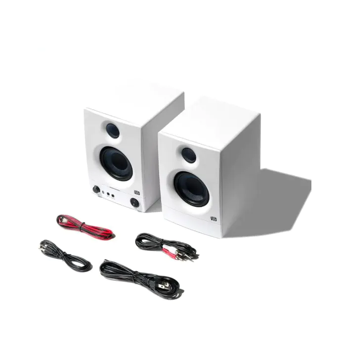 The Eris® 3.5BT media reference monitors offer studio-quality sound in a compact design, ideal for bedroom studios, video production, and gaming. With 25 watts per side, these monitors provide clear, accurate audio with tight bass and refined highs. Features include a 3.5-inch woofer, a one-inch silk-dome tweeter for a wide listening area, and improved speaker voicing for richer lows and smoother transitions.