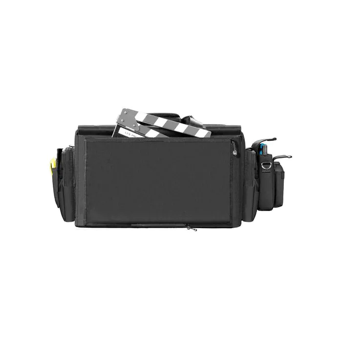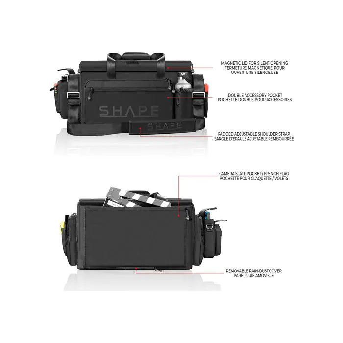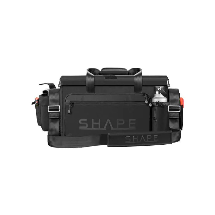 The black Camera Bag with Removable Pouches from SHAPE provides organized storage for video cameras up to 20″ long plus multiple accessories. This 36-liter bag features three removable pouches with MOLLE straps for tools, cables, and pens. Its exterior sports a silent, magnetic lid, dual-zippered front pockets, a slate/flag pocket, a bottle pocket for canned air, and hook-and-loop surfaces for easy labeling.
