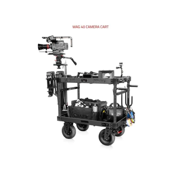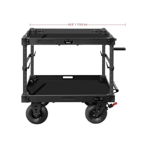 Measuring 26.7 x 45.5 x 40″, the SHAPE Wagon 40″ Camera Cart is an equipment cart designed to carry camera gear, tools, and accessories in the studio and on location. The cart requires no tools for assembly/disassembly, so you can build or break down the cart with ease. The shelves have glass-filled nylon corners for stability. The Wagon features 1/4″-20 and 3/8″-16 screw theads on the front fence. The cart and its wheels collapse to a compact flight-case form that measures 6.8″ thick, with a travel handle, integrated rolling wheels, and a spring-loaded latch system. In its flight case form, the cart becomes portable and easily transportable. The cart’s adjustable handles simplify movement up curbs, entryways, and inclines.