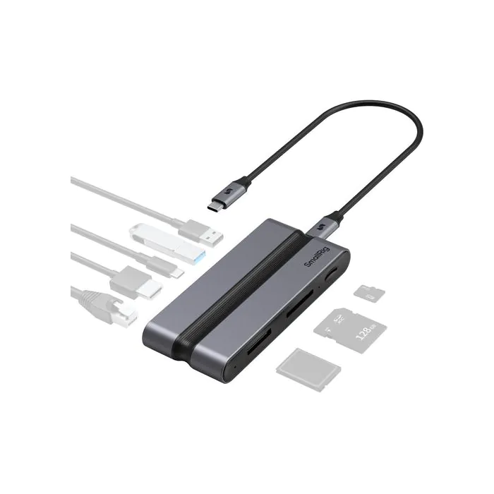 This CFexpress Type A 9-in-1 Docking Station from SmallRig provides high-speed data transfer and versatile conductivity. It has a durable aluminum casing with an effective heat dissipating design, making it perfect of extended usage sessions. It allows simultaneous reading of CFexpress, SD, and microSD cards with a maximum transfer speed of 10 GB/s via the USB 3.2 Gen 2 protocol. It also supports Ethernet speeds of up to 1000 Mb/s.