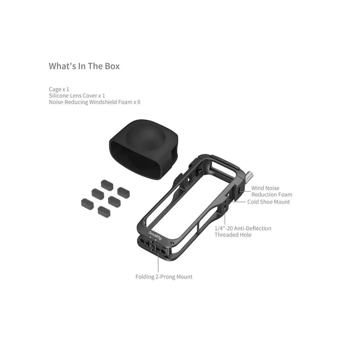 The cage features two integrated shoe mounts and two 1/4″-20 anti-twist threads that enable you to quickly add a light, microphone, or another accessory. The camera can be mounted on a tripod or handheld gear using the folding 2-prong action camera mount for vertical shooting or one of the 1/4″-20 threads on the side for horizontal shooting. The included silicone cover protects your lens when not in use.