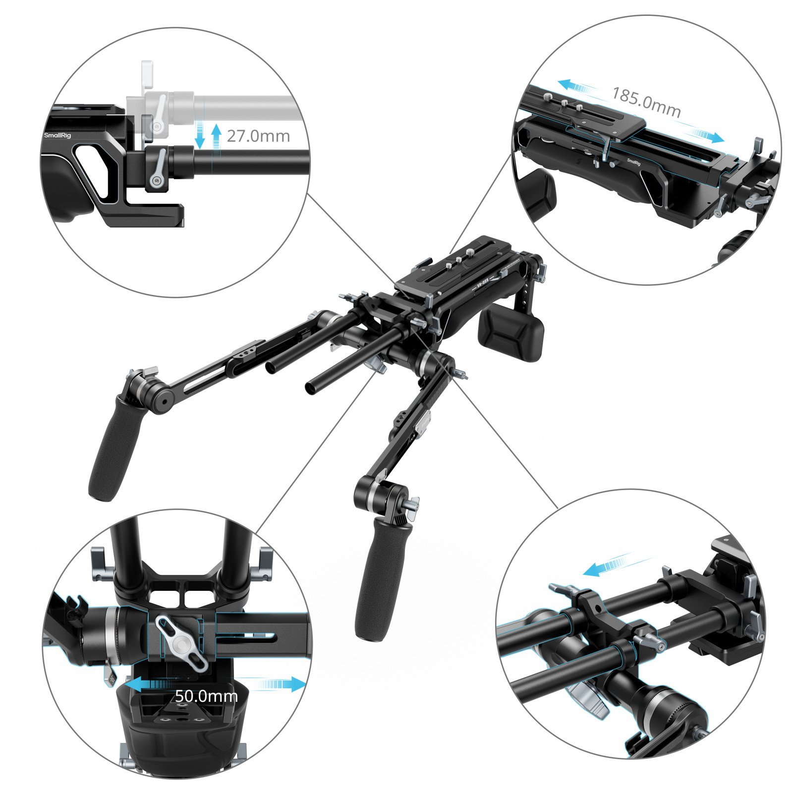 Dual quick-release plates allow 185mm front-to-back adjustment