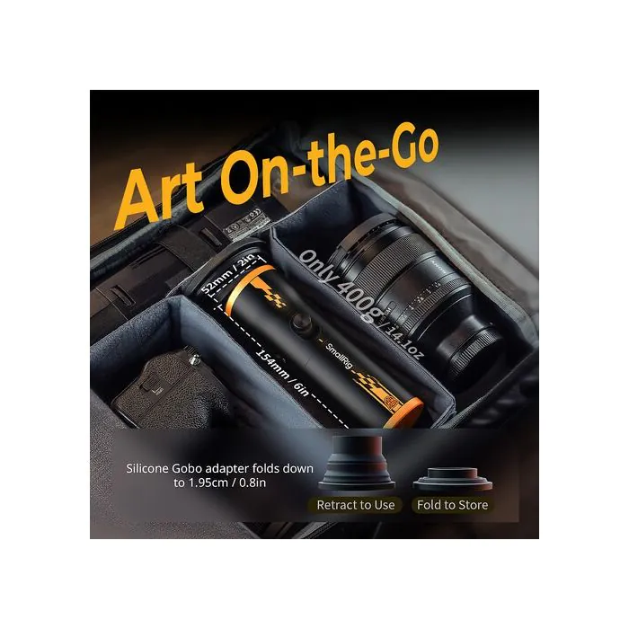 SmallRig RF 10C Portable Focusable LED Video Light 5512 is an integral component of SmallRig’s portable lighting ecosystem. Crafted from aluminum alloy in a sleek dark color scheme, this compact and lightweight video light is both stylish and practical, fitting easily into any photography backpack. Featuring four-color LED lamp beads (sunset orange, blue, white, and red), with a maximum power of 10W and a CRI Ra≥96, TLCI≥98, illuminance reaches 1,570lux@0.5m / 5600K, this high-quality light source ensures professional color rendering and brightness adjustment to meet various shooting requirements. Equipped with 20+ light filters, it supports a variety of atmospheric projection effects, enhancing your lighting setup for more creative possibilities. The convex mirror’s front push-pull design facilitates beam size adjustment, providing the capability for precise focusing in a smaller range (adjustable focus angle of approximately 10°-60°). The zoom adjustment offers smooth control and excellent damping for seamless aperture range adjustments. With a new anti-misoperation feature, the light requires button rotation to power on, effectively averting inadvertent activation that could result in unnecessary power consumption. With a mere 4.3cm (1.7in) diameter, the handle offers a comfortable and ergonomic grip. Featuring three 1/4″-20 threaded holes on the side and rear, this light enables versatile lighting configurations, catering to various shooting scenarios. Equipped with a built-in 27.75Wh lithium battery that supports USB-C charging, this light provides approximately 3 hours of continuous full-power lighting, ensuring uninterrupted support for your shooting needs.