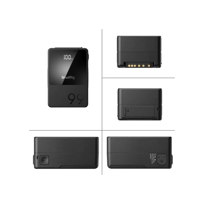 The VB99 Mini V-Mount Battery from SmallRig is an ultracompact, lightweight 99Wh battery that can support up to a 14A draw at a nominal 14.8V. This travel-friendly battery is suitable for powering handheld cameras, drones, and gimbals. The VB99 provides multiple accessory ports, including one 14.8V D-Tap output, one 8 VDC barrel output, one 12 VDC barrel output, one USB-C output, and one USB-A output for powering various accessories, cameras, or mobile devices.