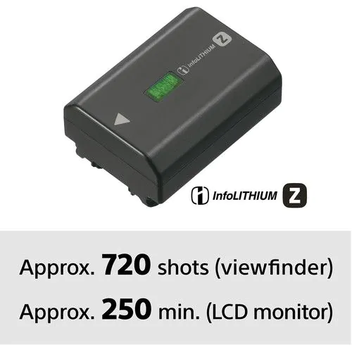 - The included NP-FZ100 rechargeable lithium-ion is rated for approximately 810 shots per charge when working with the LCD screen.