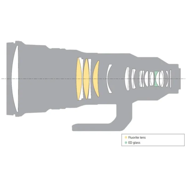 • Three fluorite elements and one extra-low dispersion element minimize axial and lateral chromatic aberrations, as well as color fringing, for high clarity and color accuracy.