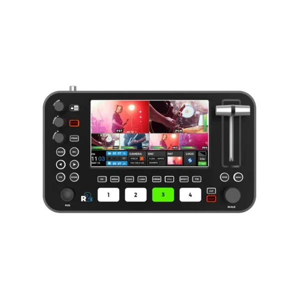 Designed for multi-camera livestreaming to the internet for broadcast, education, or business applications, the compact NeoLIVE R2 Plus 1080p Livestreaming Mixer from Sprolink features direct streaming to popular platforms, using the built-in streaming engine and your Ethernet connection plus USB-A and USB-C recording to external disks. This compact switcher provides gaming, corporate, and education livestreams in a four-input live production switcher with an integrated control panel, a T-bar, a 5.5″ 1080p LCD monitor, and two HDMI outputs for external monitoring. Switch between the four HDMI inputs for a live-switched stream of up to 1080p60 resolution and use the RJ45 Ethernet port for system management and remote control of IP PTZ cameras.