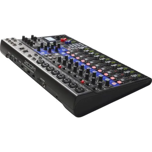 The highly flexible Zoom LiveTrak L-12 is a 12-channel digital mixer and multitrack recorder, well suited for live performances, studio recording, band rehearsals, podcasts, and more. The compact mixer features 8 mono channels, each with combo mic/line XLR-1/4″ inputs with high gain, low-noise microphone preamps, +48V phantom power, and a single compression knob, while the two stereo inputs offer dual 1/4″ and RCA inputs. Channels 1-2 also offer Hi-Z inputs for connecting guitars and basses. All channels work with the on-board channel strip, which provides a low-cut filter, a 3-band EQ, a pan control, and a send FX for sending signal to the 16 built-in high-quality effects processor with a dedicated EFX Return channel.
